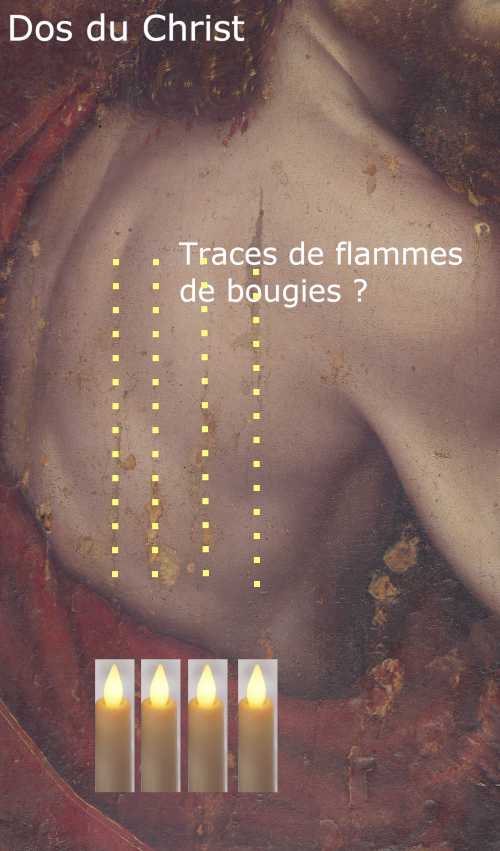 Dans ce cadre, Maurizio Seracini propose que les altérations verticales visibles dans le dos du Christ puissent provenir de flammes de bougies placées sous l’image, hypothèse fondée sur des cas comparables.