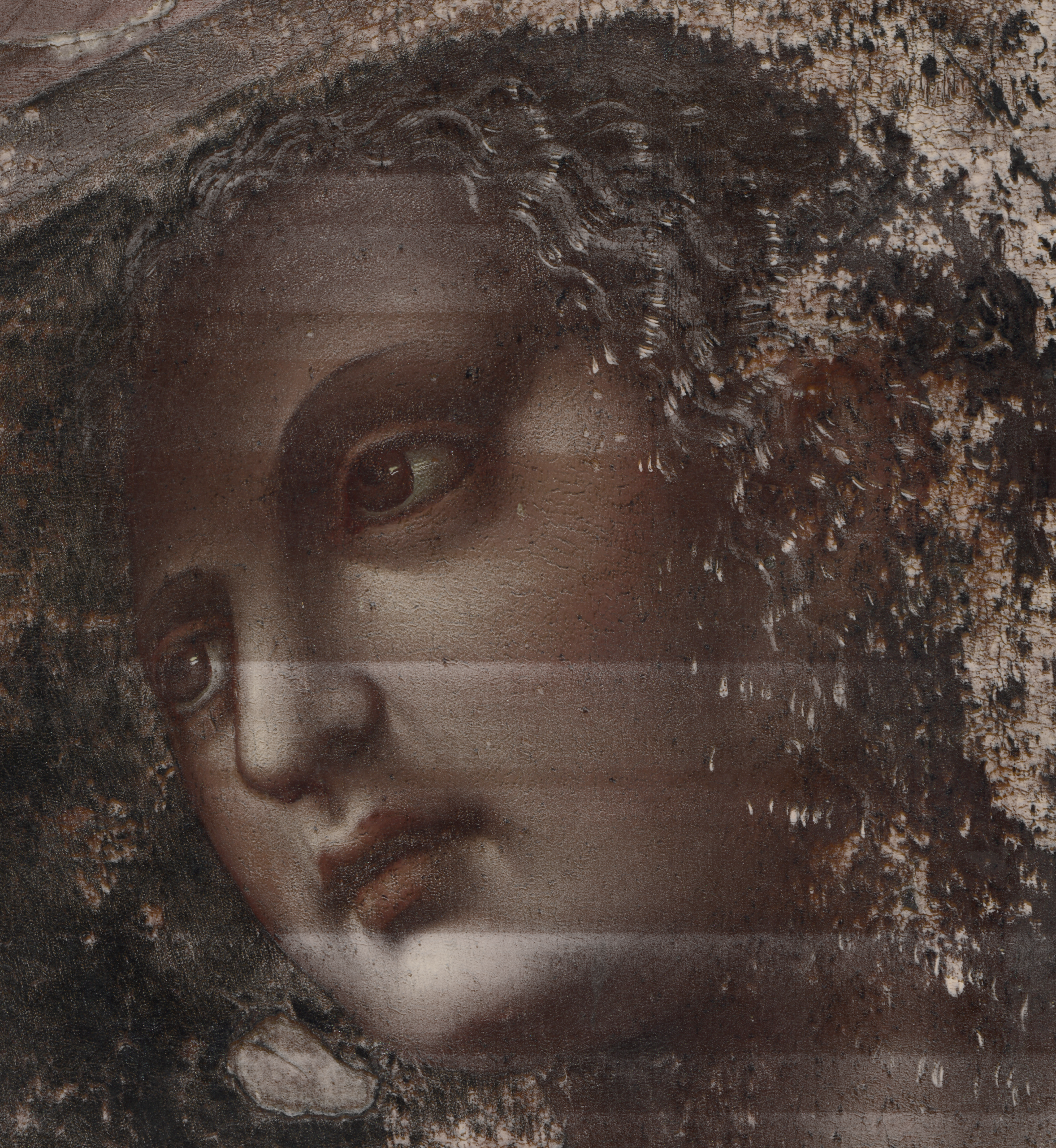 L’image du personnage présentée ici provient d’une superposition entre l’image visible et une image LAM (multispectrale), procédé qui permet de faire réapparaître des informations devenues peu lisibles, notamment une chevelure en grande partie disparue.