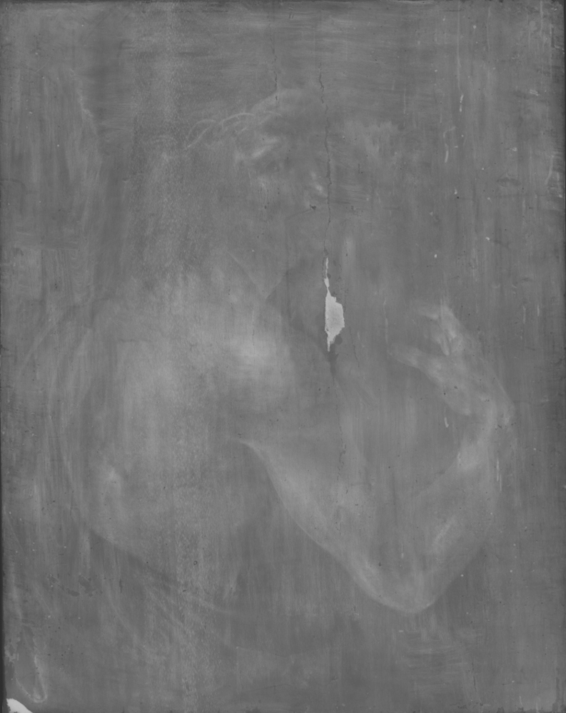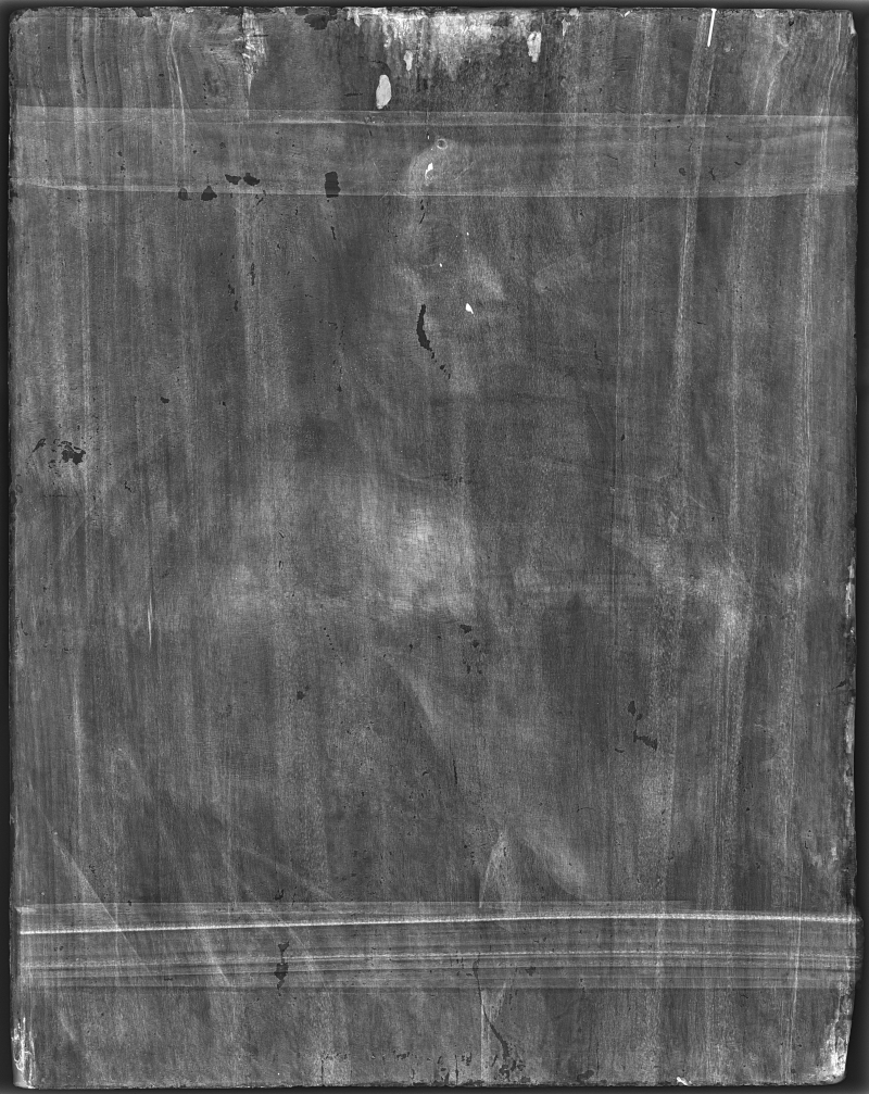 La radiographie du ‘Tableau’ est plus contrastée, révélant clairement les zones peintes avec du blanc de plomb. L’image rayons X montre aussi que l’artiste a retiré de la peinture du front et de la barbe du Christ pendant qu’elle était encore fraîche, indiquant ainsi une modification effectuée durant la réalisation, c’est à dire un repentir de couleur (cf. Etude Tableau p 76).