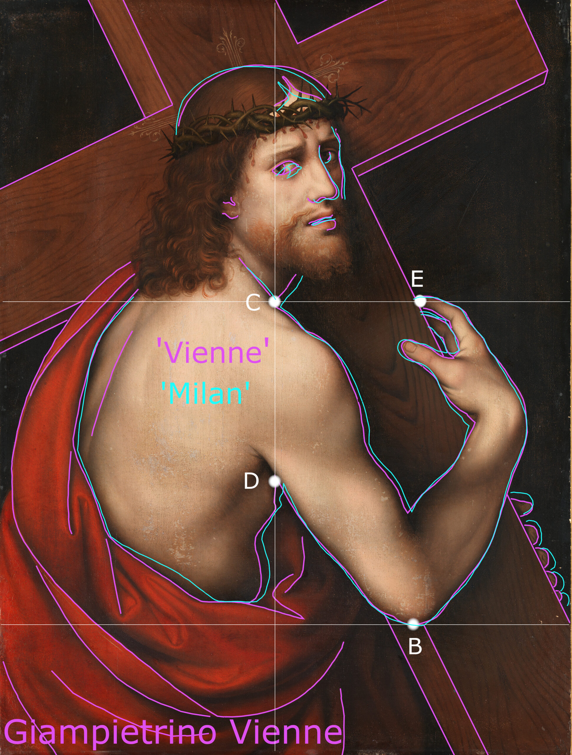 La comparaison des tracés des images infrarouges (5) et visibles confirmerait l’usage d’un même carton pour ‘le Tableau’ et les trois ‘Giampietrino’ de Londres, Budapest et de Turin. Un même carton agrandi, aurait servi pour les versions de Vienne et de Milan.