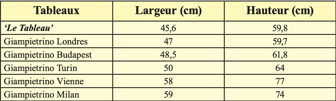 Les informations relatives aux sources des images et à leurs dimensions, en centimètres et en pixels figurent en Annexe 13 et Annexe 14 de l’étude du Tableau.