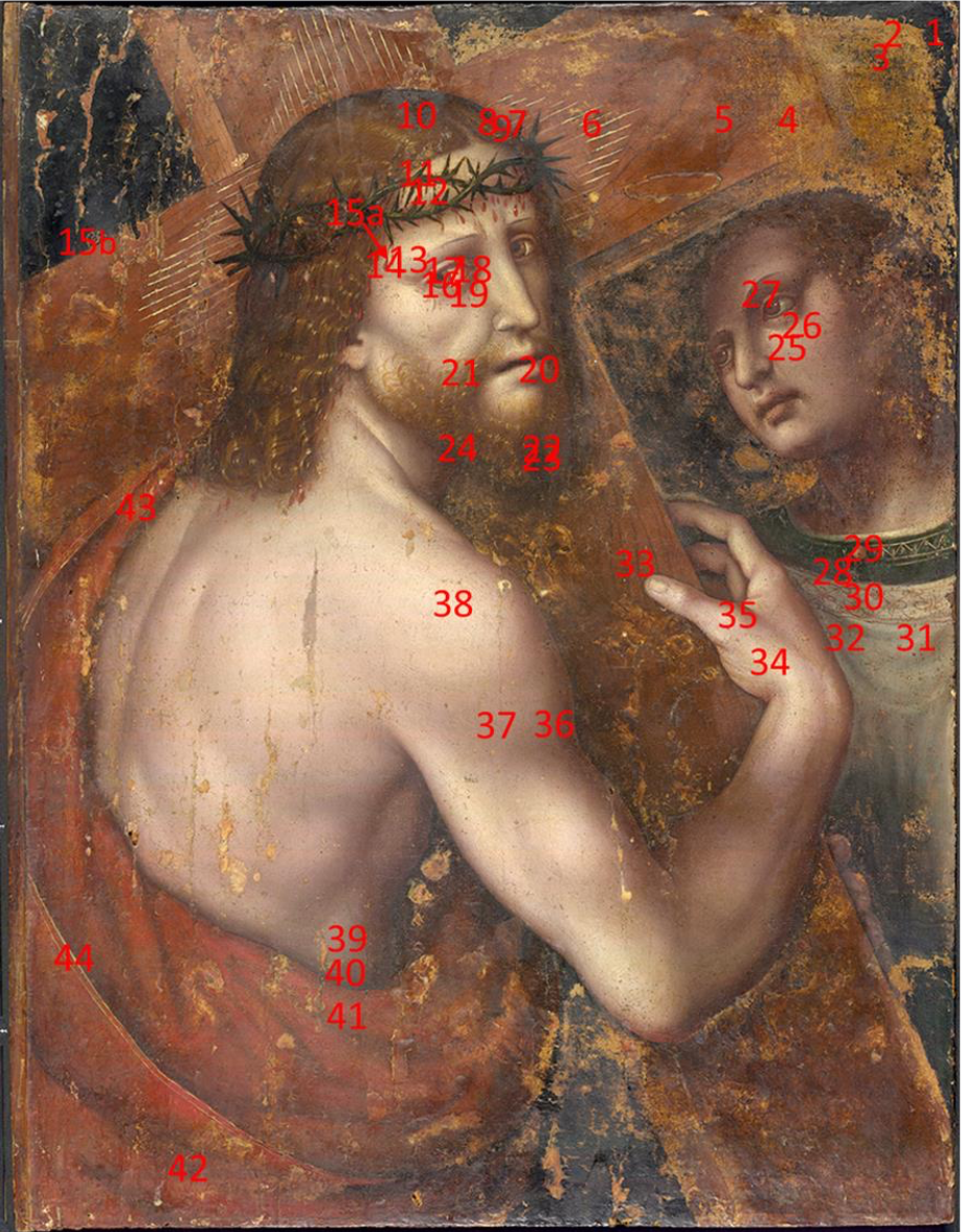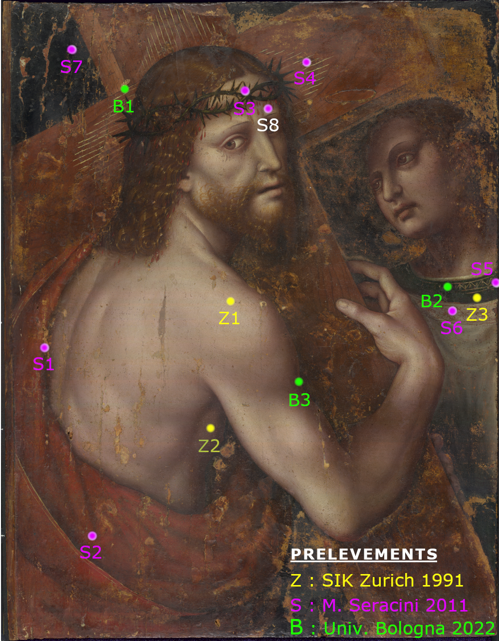 La couche picturale est documentée par 14 prélèvements réalisés entre 1990 et 2022 (SIK ISEA Zurich : 3 ; Seracini/Editech Florence : 8 ; Université de Bologne – Ravenne : 3). En complément, l’Université de Bologne a conduit une campagne non destructive (XRF) avec vidéomicroscope, portant sur 44 points de mesure.