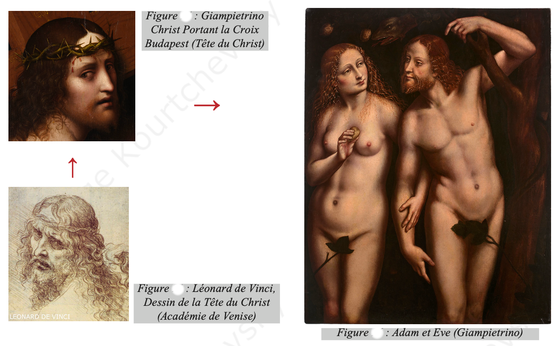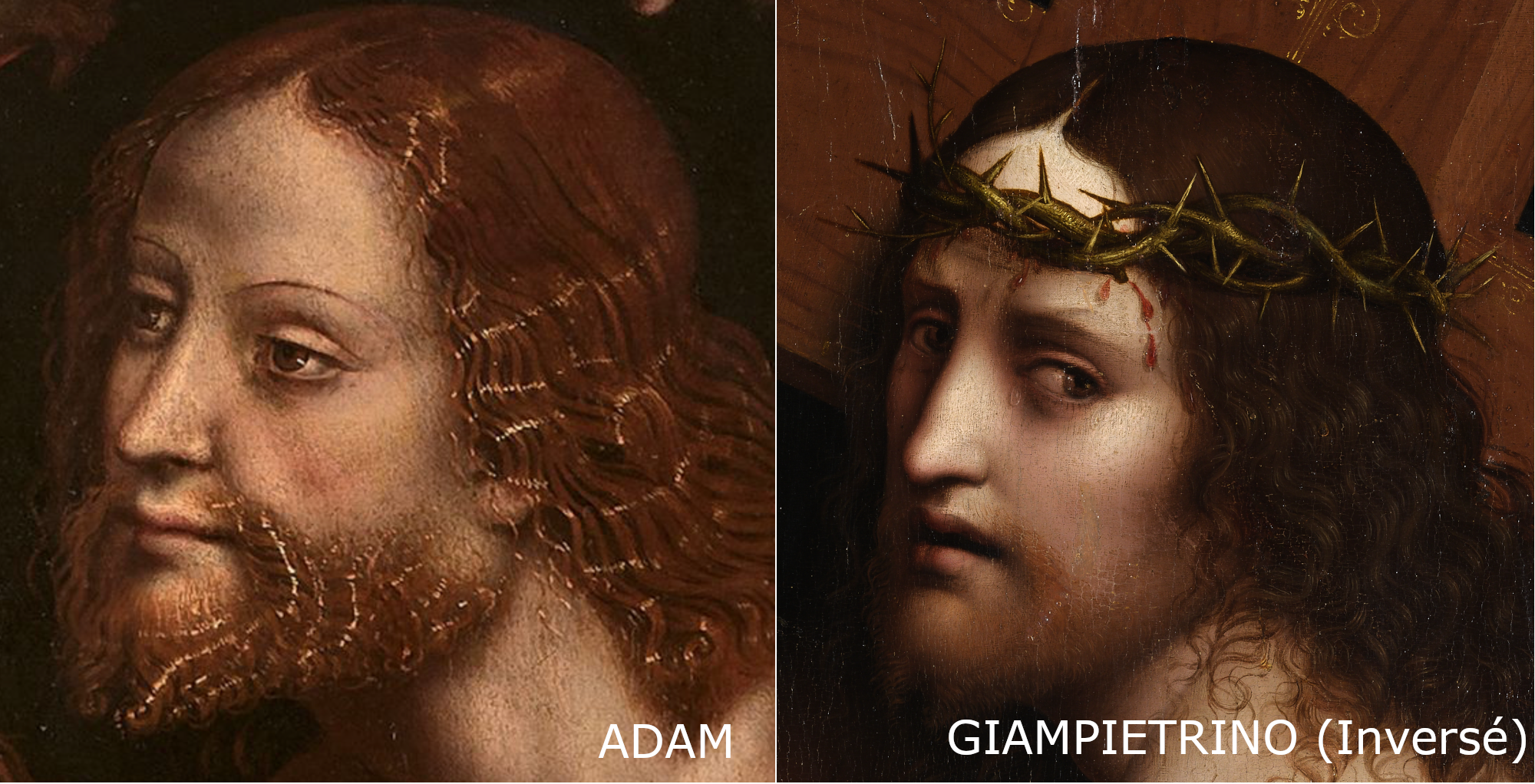 L’analyse de la tête d’Adam révèle une structure très proche de celle des Christ Portant la Croix de Giampietrino. Ces peintures sont elles-mêmes dérivées (2) (3) du Dessin de la Tête du Christ de Venise.
