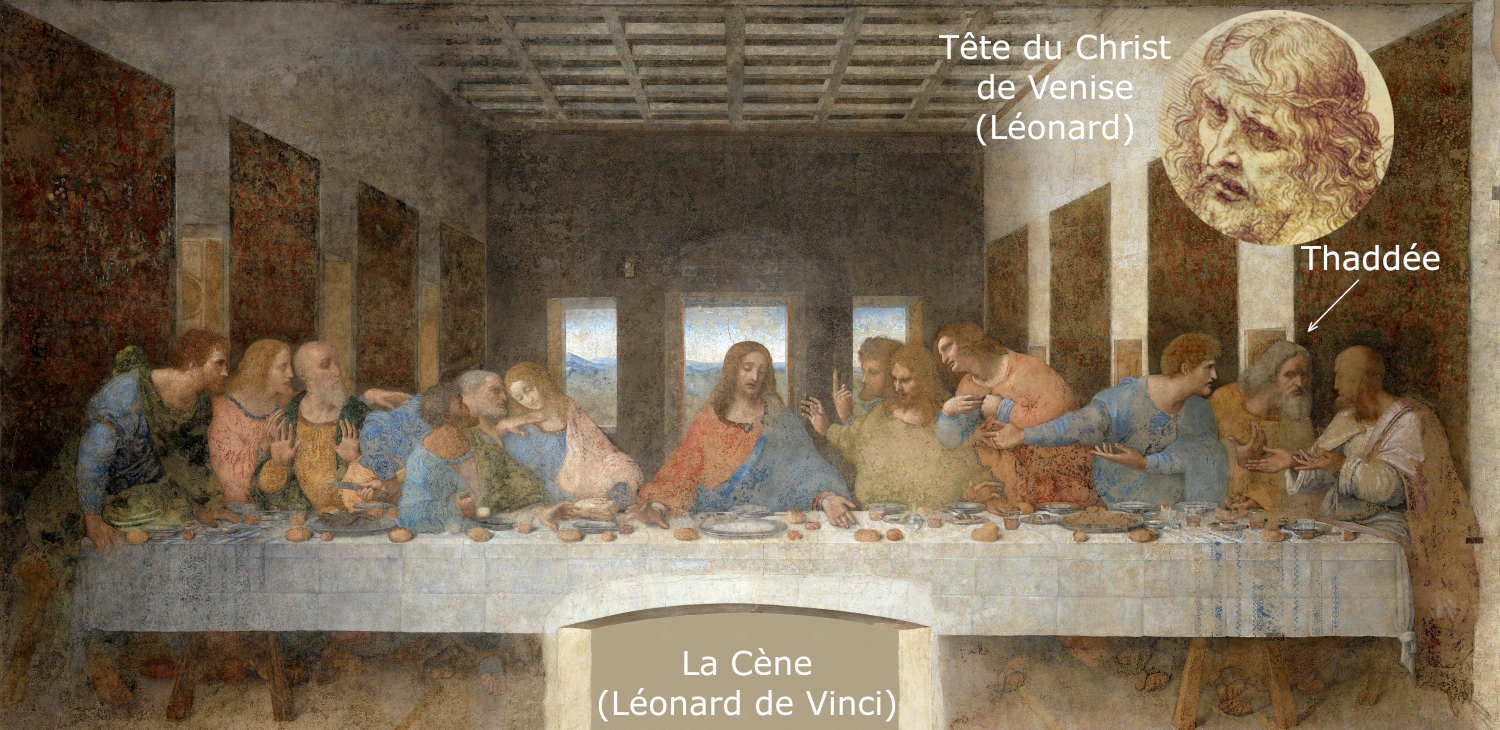 Le point de départ de cette étude est simple : parmi les nombreuses hypothèses formulées autour du Dessin de Venise, certaines suggèrent un lien possible avec La Cène, sans que celui-ci ait fait l’objet d’une analyse approfondie. C’est ce lien que nous nous proposons d’examiner ici, de manière ciblée : entre le Dessin de la Tête du Christ, d’une part, et la tête de l’apôtre Thaddée dans La Cène, d’autre part. En raison de l’état de conservation de la peinture originale, notre analyse s’appuie sur les copies anciennes.